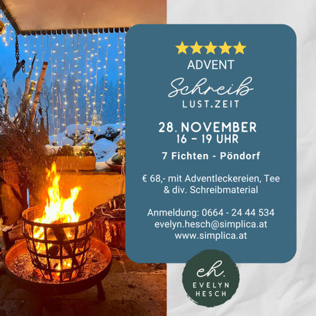 Die stille Zeit steht vor der Tür. Klopft sie laut oder ganz sacht, um dich einzuladen, dich behutsam auf ihre Wunder einzulassen? Gemütlich rücken wir zusammen, um miteinander auf den Advent zu blicken. Am Papier malen wir Wortbilder, die uns erden und eintauchen lassen in diese glitzernde, funkelnde Jahreszeit. Was bedeutet Weihnachten für dich? Welche Worte und Gefühle braucht es, um in dir Weihnachten werden zu lassen? Mit beflügelnden Schreibimpulsen führe ich dich behutsam in die Magie des Advents. Wir beleuchten das, was lichtvoll und hell leuchten darf für dich zum Jahresende, wo wohlige Wärme und Liebe dich umfangen mag. Lass es still werden in dir und schreib mit uns.