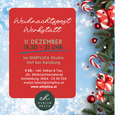 Na, wie findest du die Idee? Schreiben ist unsere auserkorene Herzensangelegenheit und du machst sicher auch lieben Menschen so gern eine Freude wie ich. Die Weihnachtszeit ist perfekt dafür. Bring deine Weihnachtskarten und Kuverts mit und was du vielleicht an Weihnachtspostmaterial noch so zu Hause hast. Wir lassen uns von unserer Fantasie beflügeln und machen ganz einfach einzigartige Weihnachtspost daraus. Eintönige, einfallslose Weihnachtsgrüße waren gestern! Wir erfinden sozusagen die Christkindpost neu, alles wird verwertet und verhübscht. Dann noch ein kleines Gedicht oder ein paar liebe Worte und ab die Post mit dem Rentierschlitten!