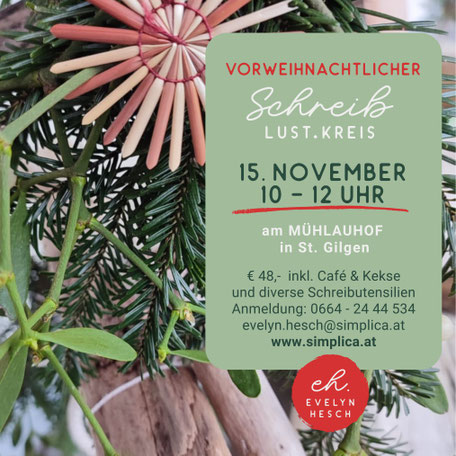 Bei diesem zauberhaften, bunten Advent-Event kommt um 15 Uhr sogar der Nikolaus. Eine Weihnachtsgeschichte zum Lauschen habe ich natürlich mit im Gepäck. Meine kleine SCHREIBlust.Werkstatt lädt dich ein zum Schwelgen in den beflügelten Worten dieser wunderbaren, stillen Zeit.